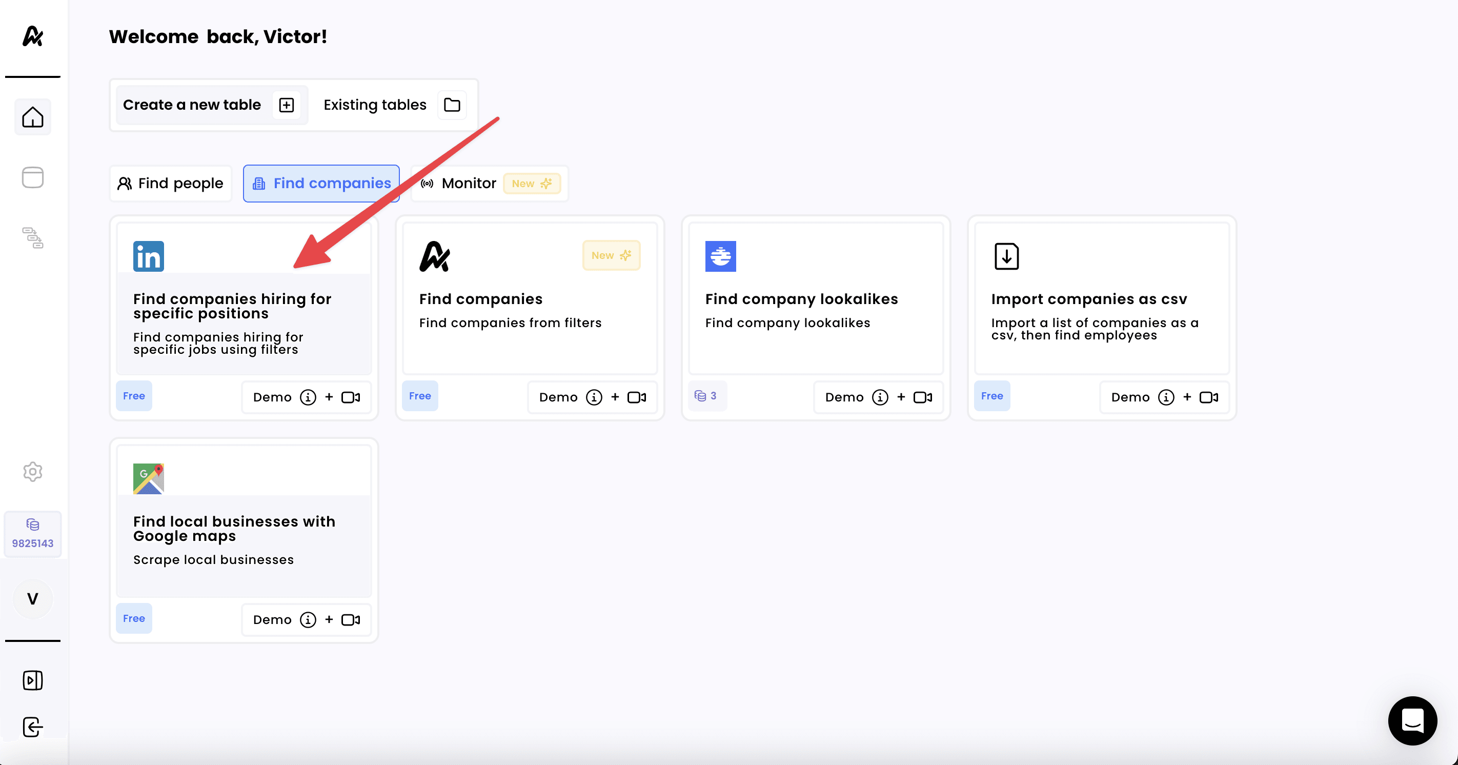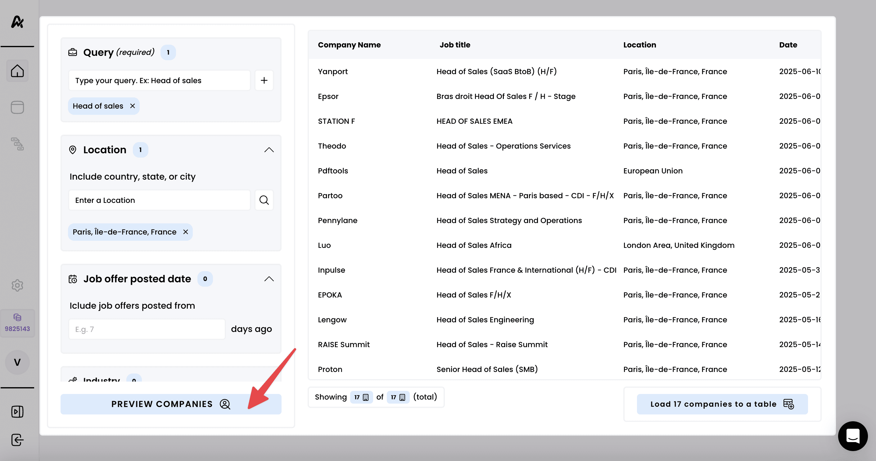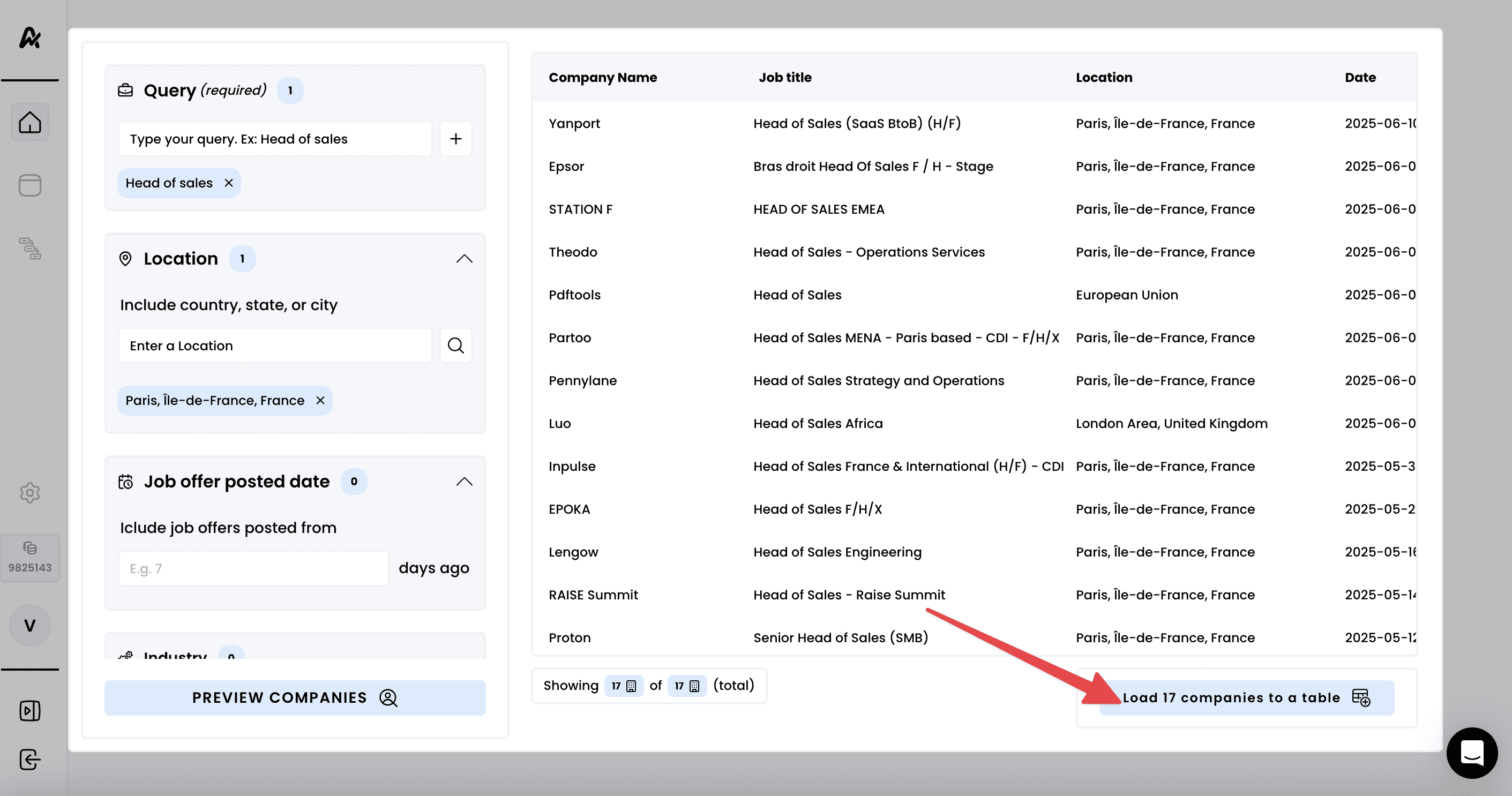 Click "Load companies to a table" to begin the scraping process and load the companies to an Airscale table