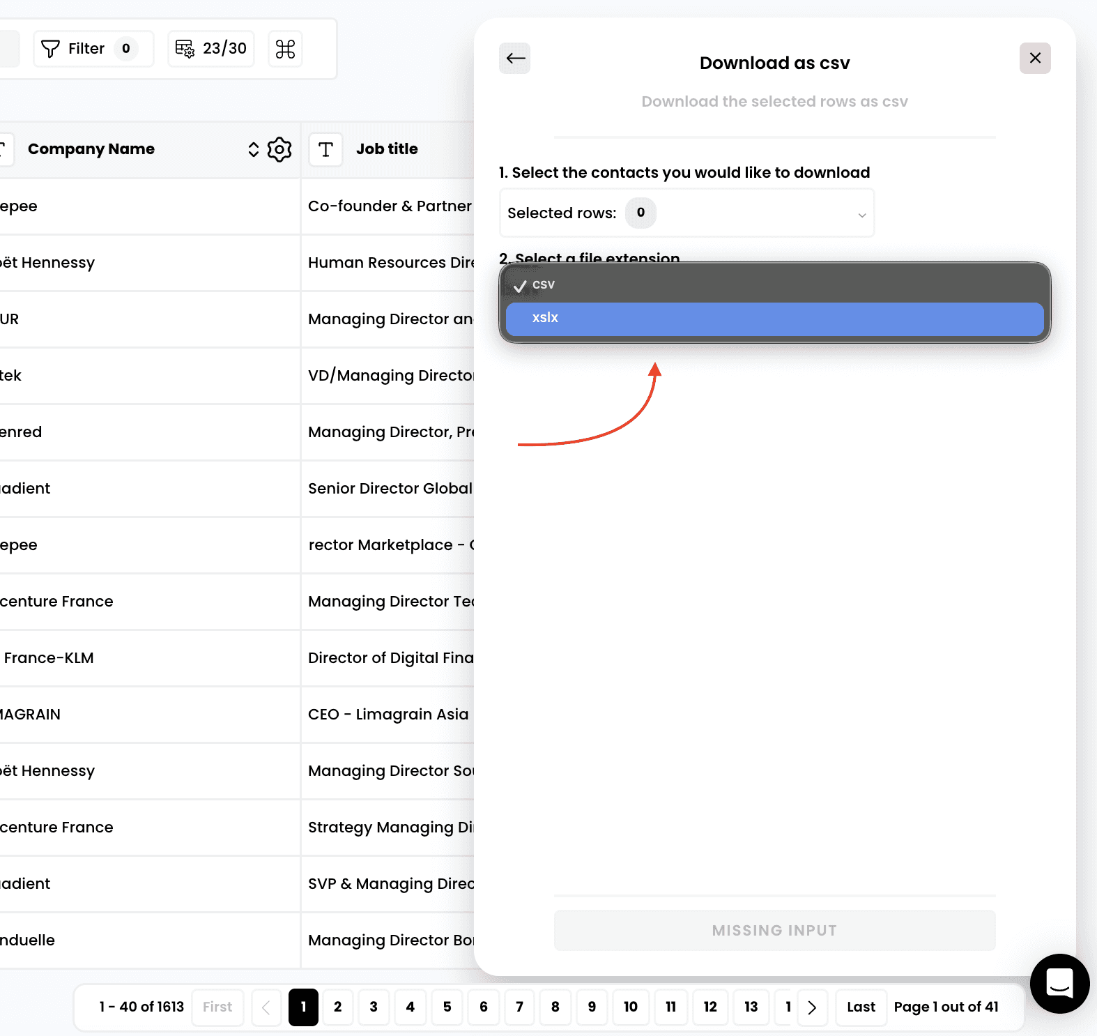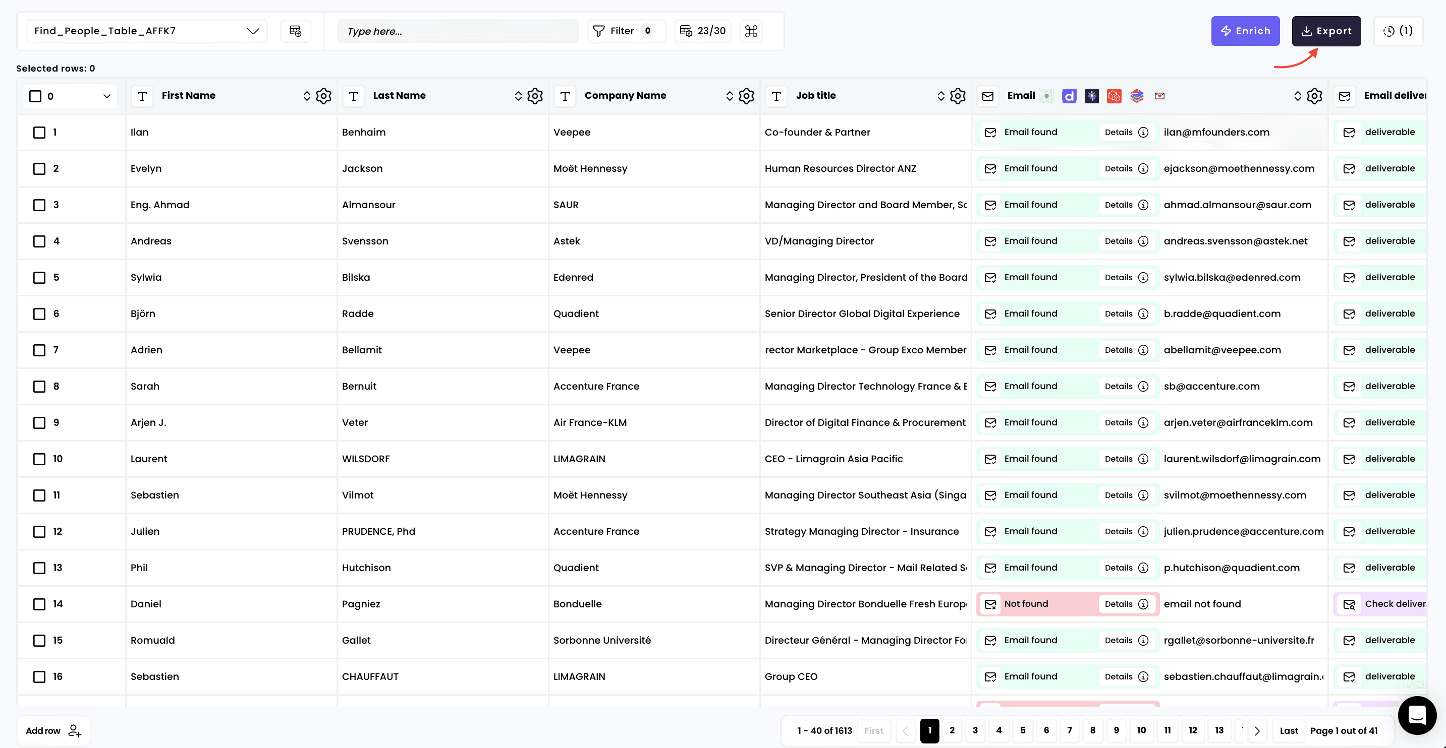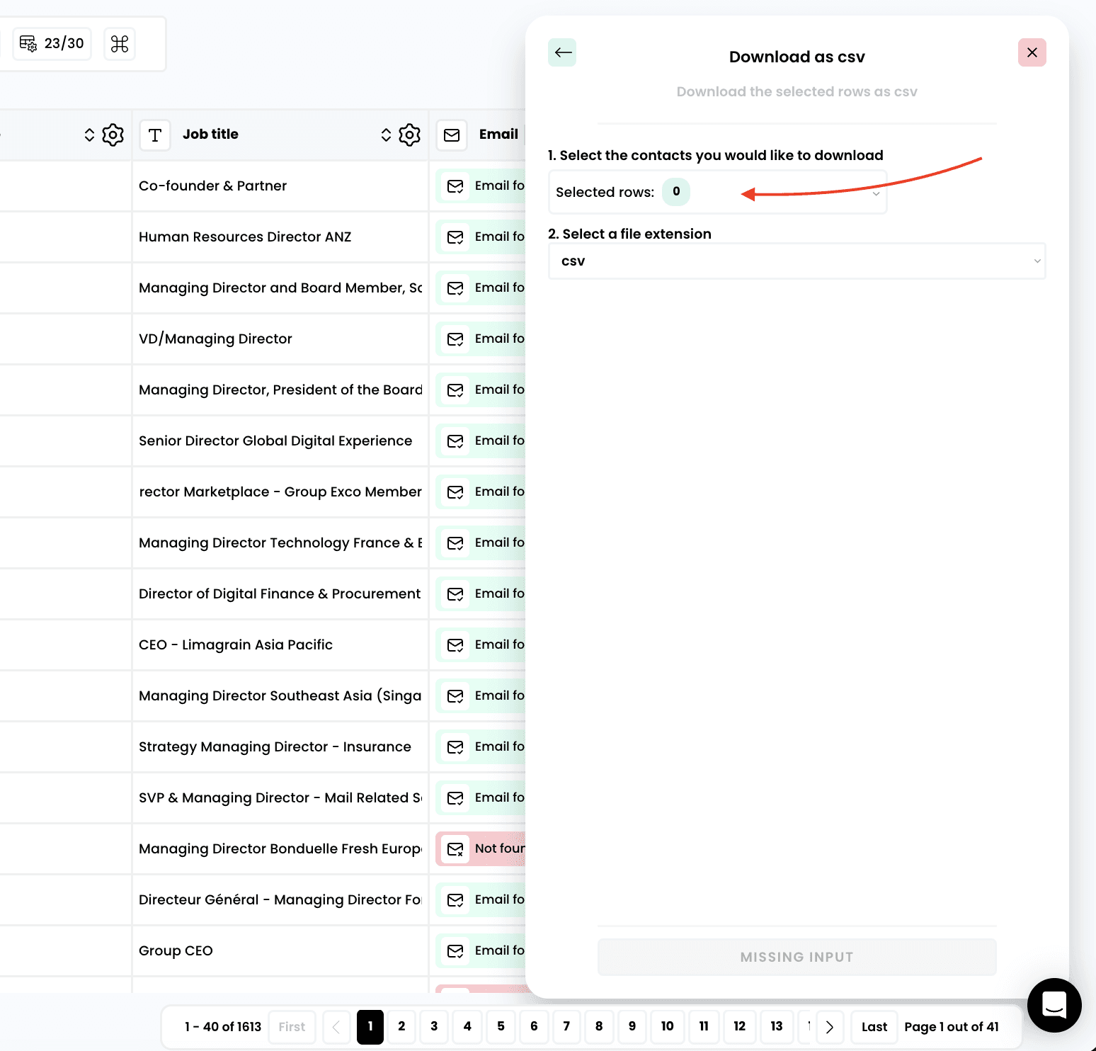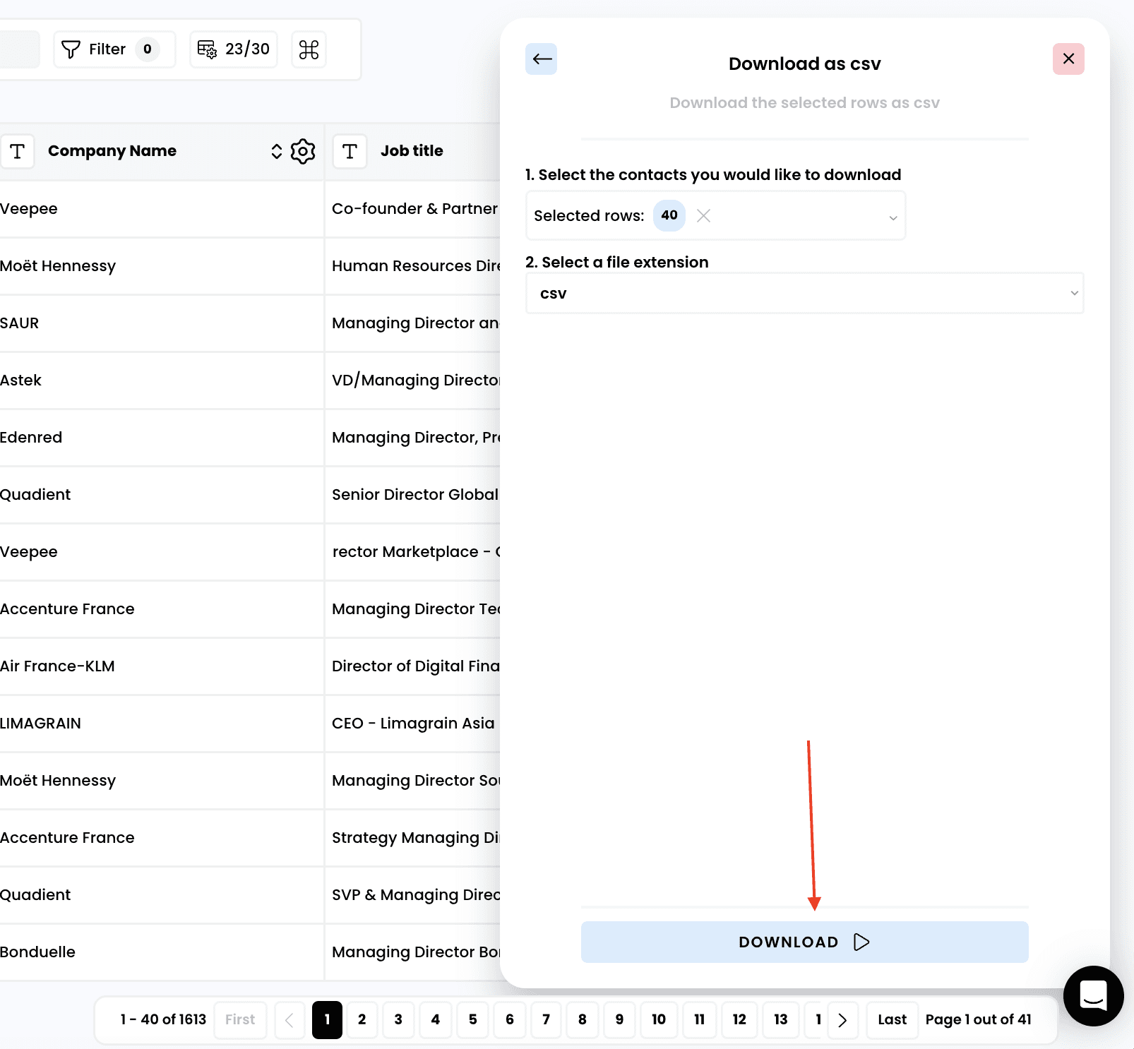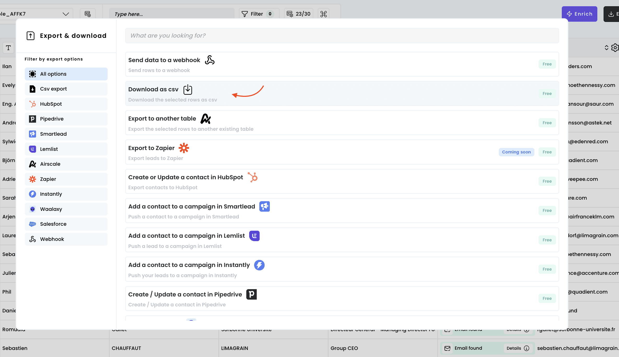 Export your prospect lists from Airscale as CSV files for use in email marketing tools, CRMs, or further analysis. This feature lets you download all enriched data while giving you full control over which contacts and columns to include