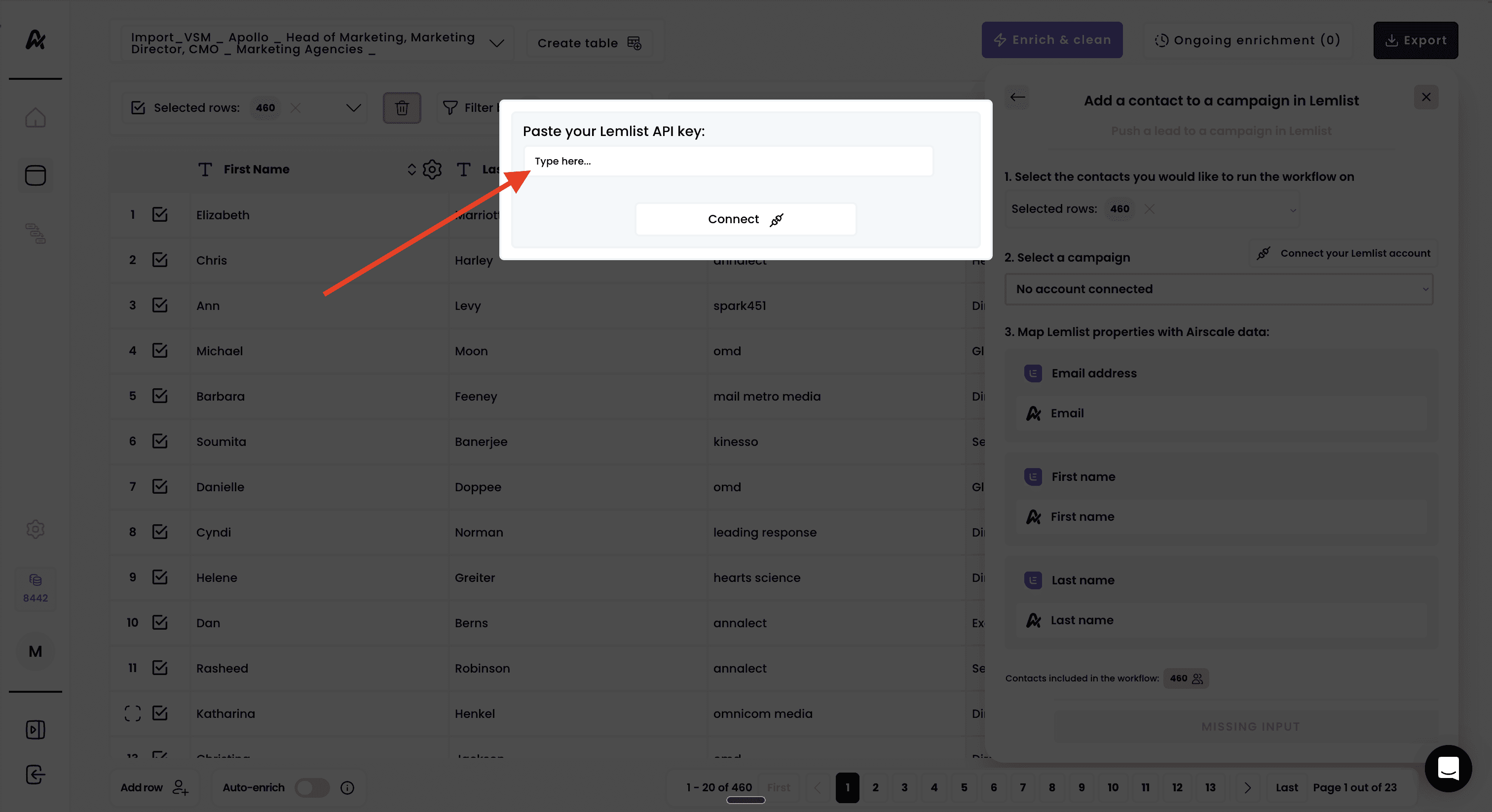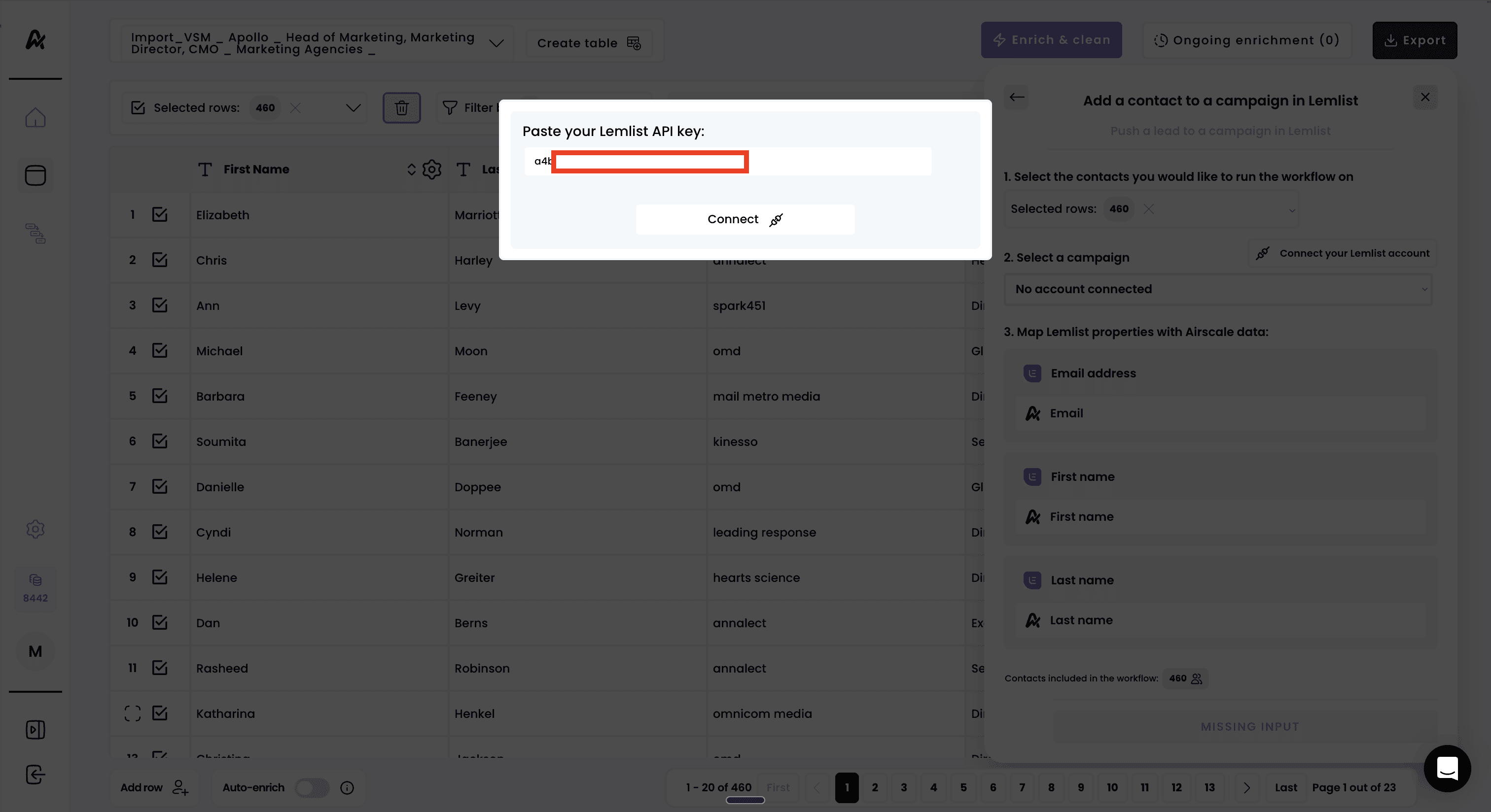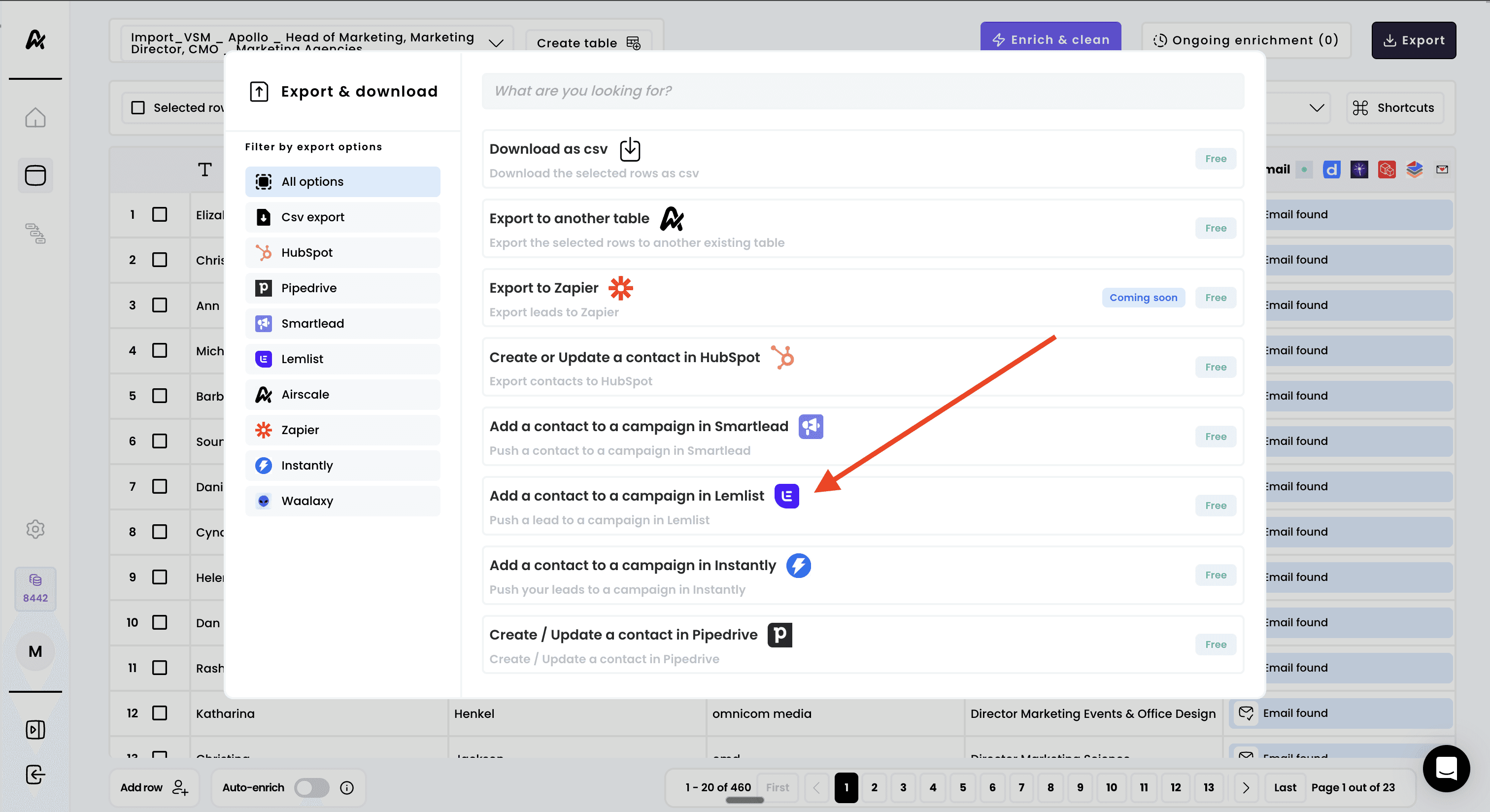 Export your prospects directly from Airscale to Lemlist campaigns for automated email outreach. This integration streamlines your workflow by pushing enriched prospect data directly into your email sequences without manual uploads or CSV exports