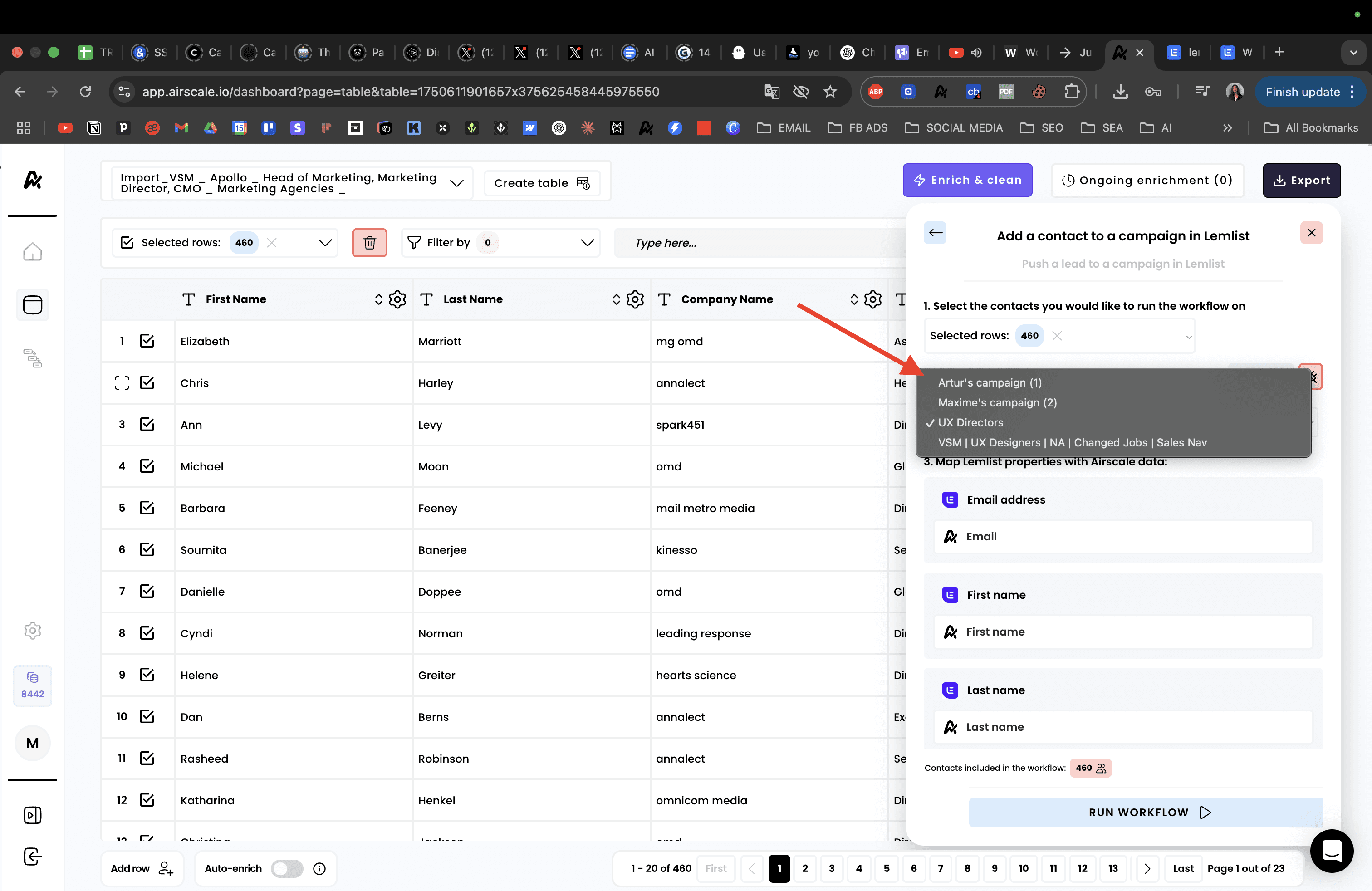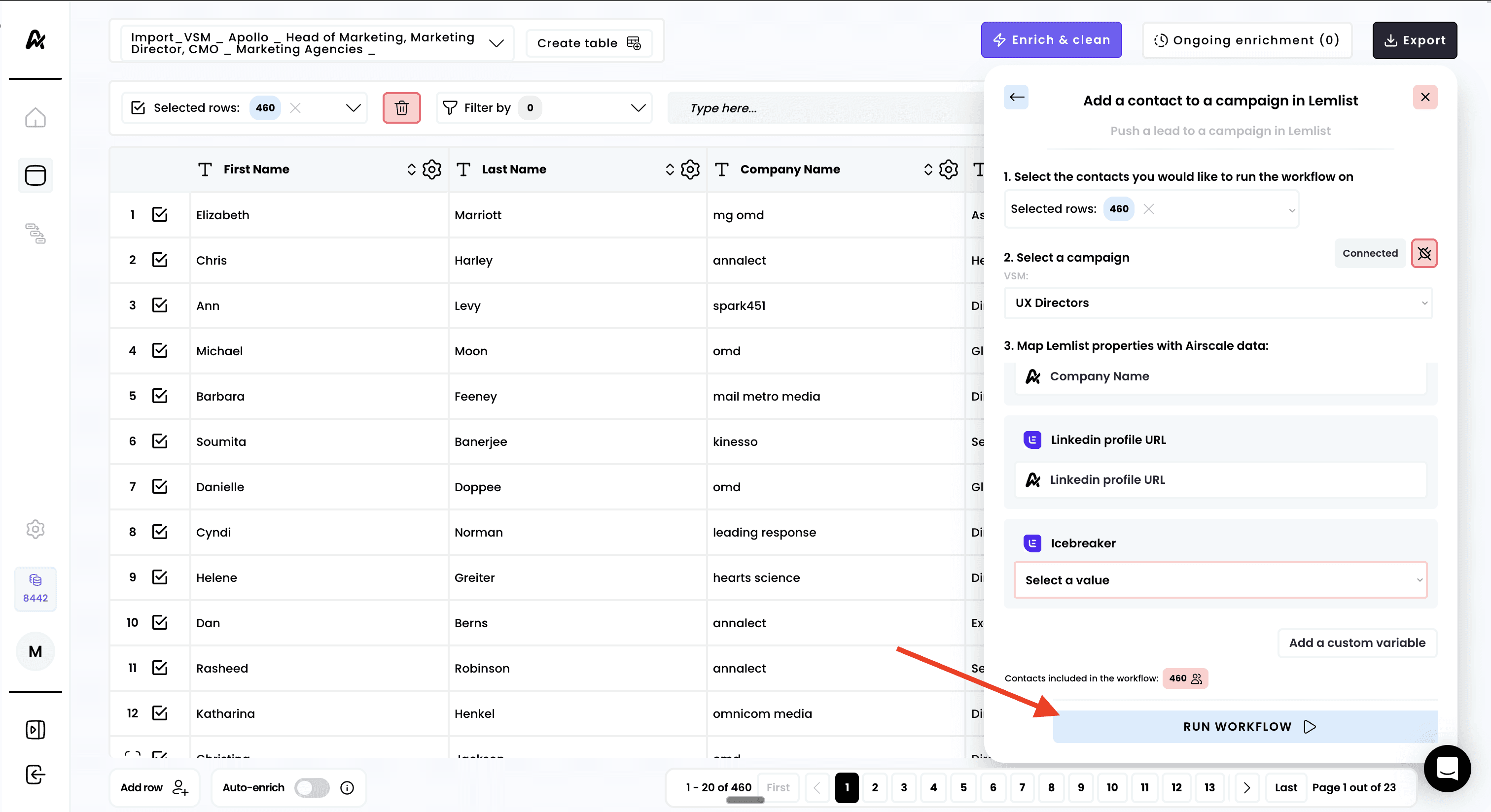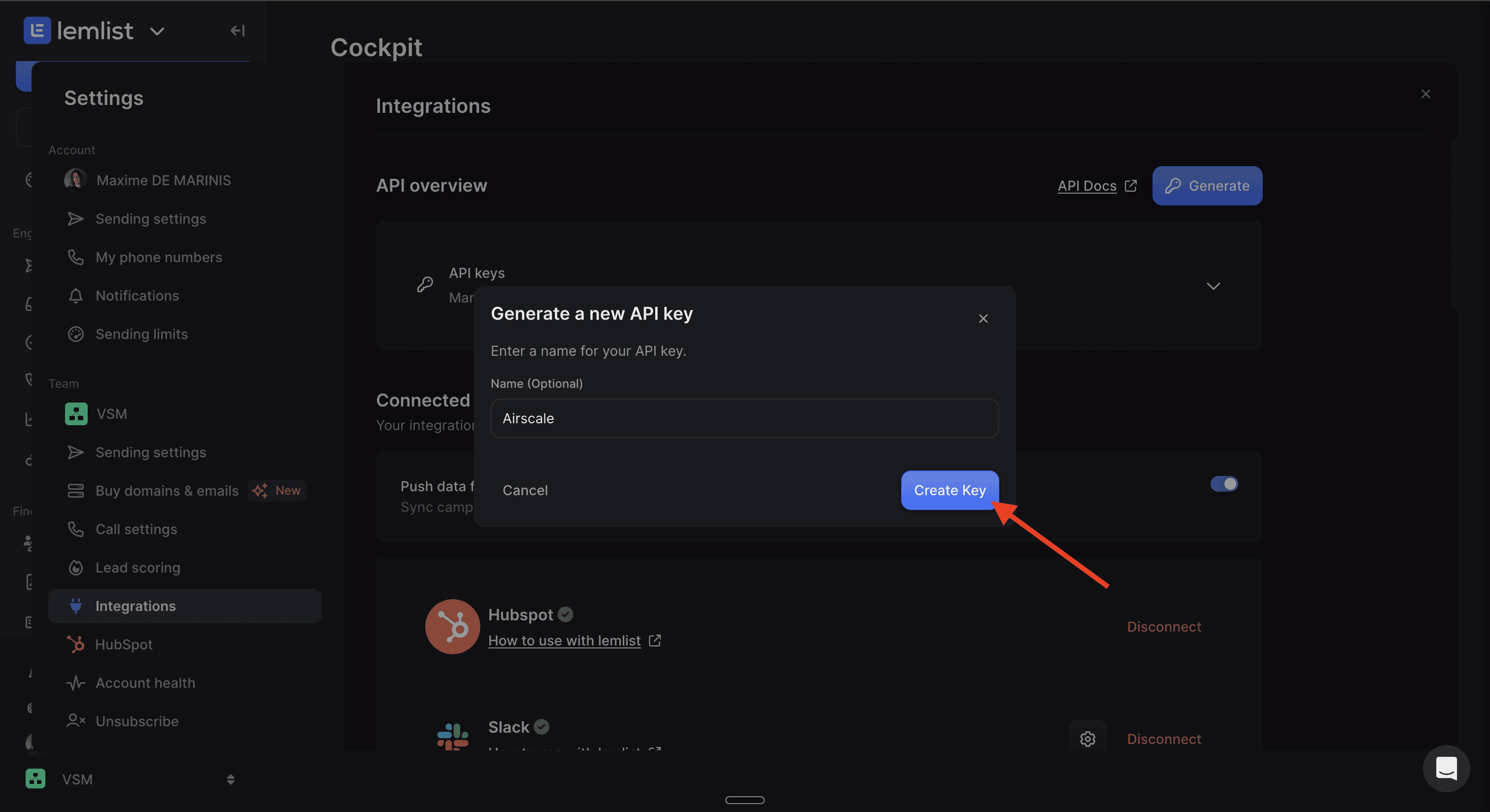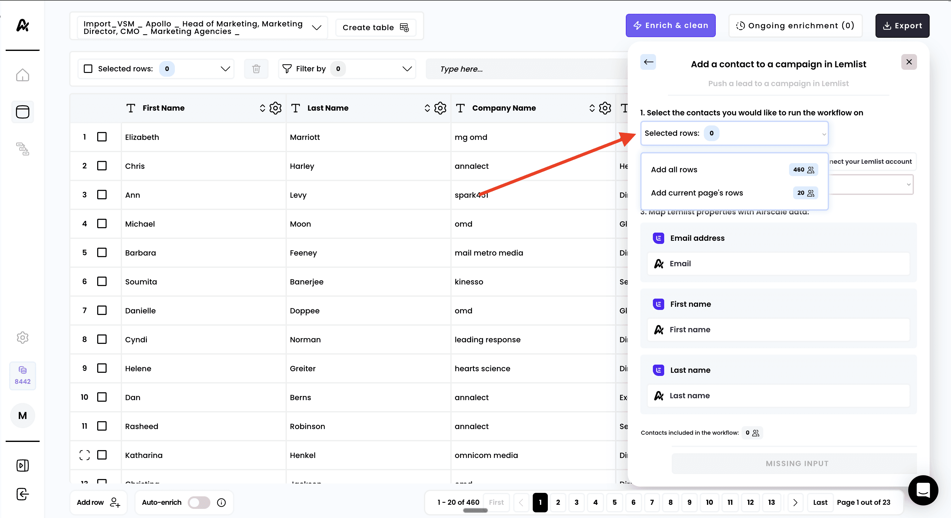 Export your prospects directly from Airscale to Lemlist campaigns for automated email outreach. This integration streamlines your workflow by pushing enriched prospect data directly into your email sequences without manual uploads or CSV exports
