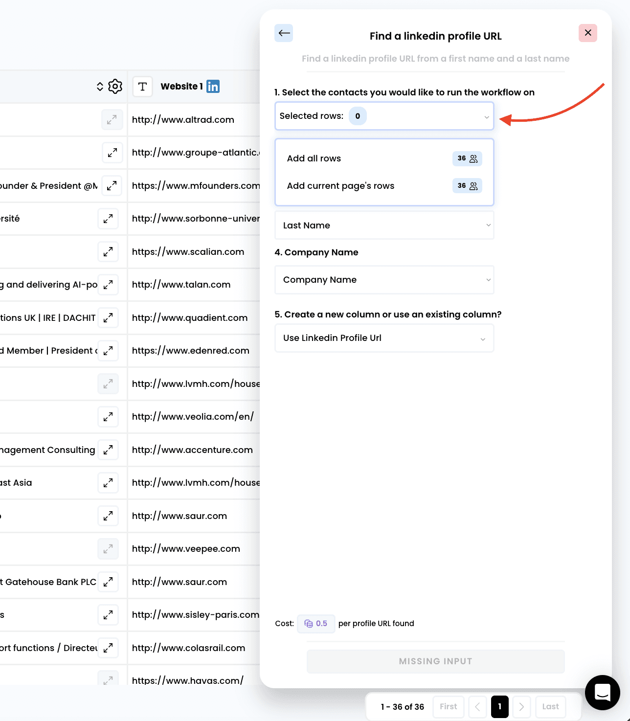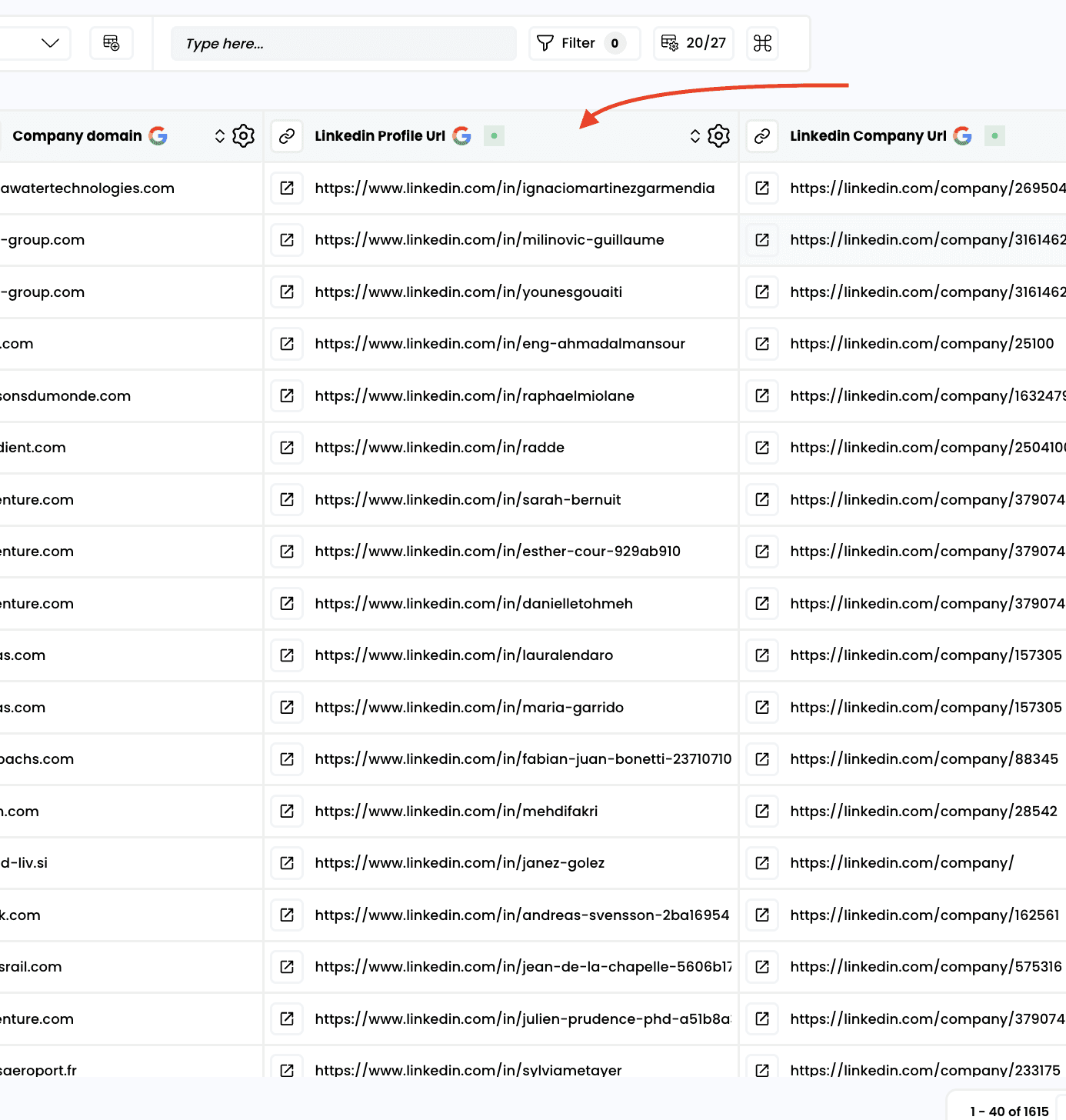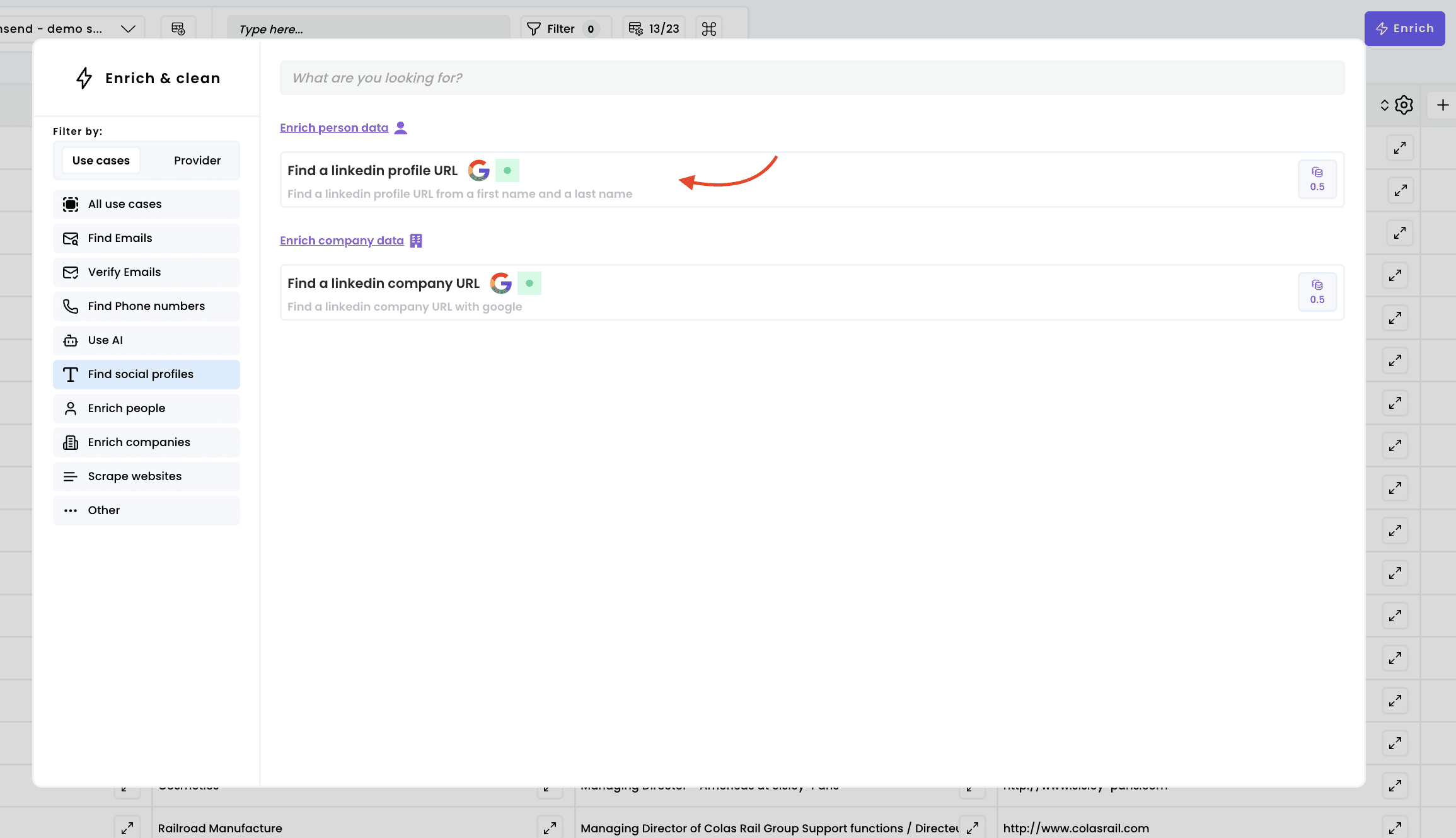 Find a LinkedIn profile URLFind a LinkedIn profile URL1Select the enrichment1Select the enrichment2Select the rows to enrich2Select the rows to enrich3Run the workflow3Run the workflow4Access the results4Access the results