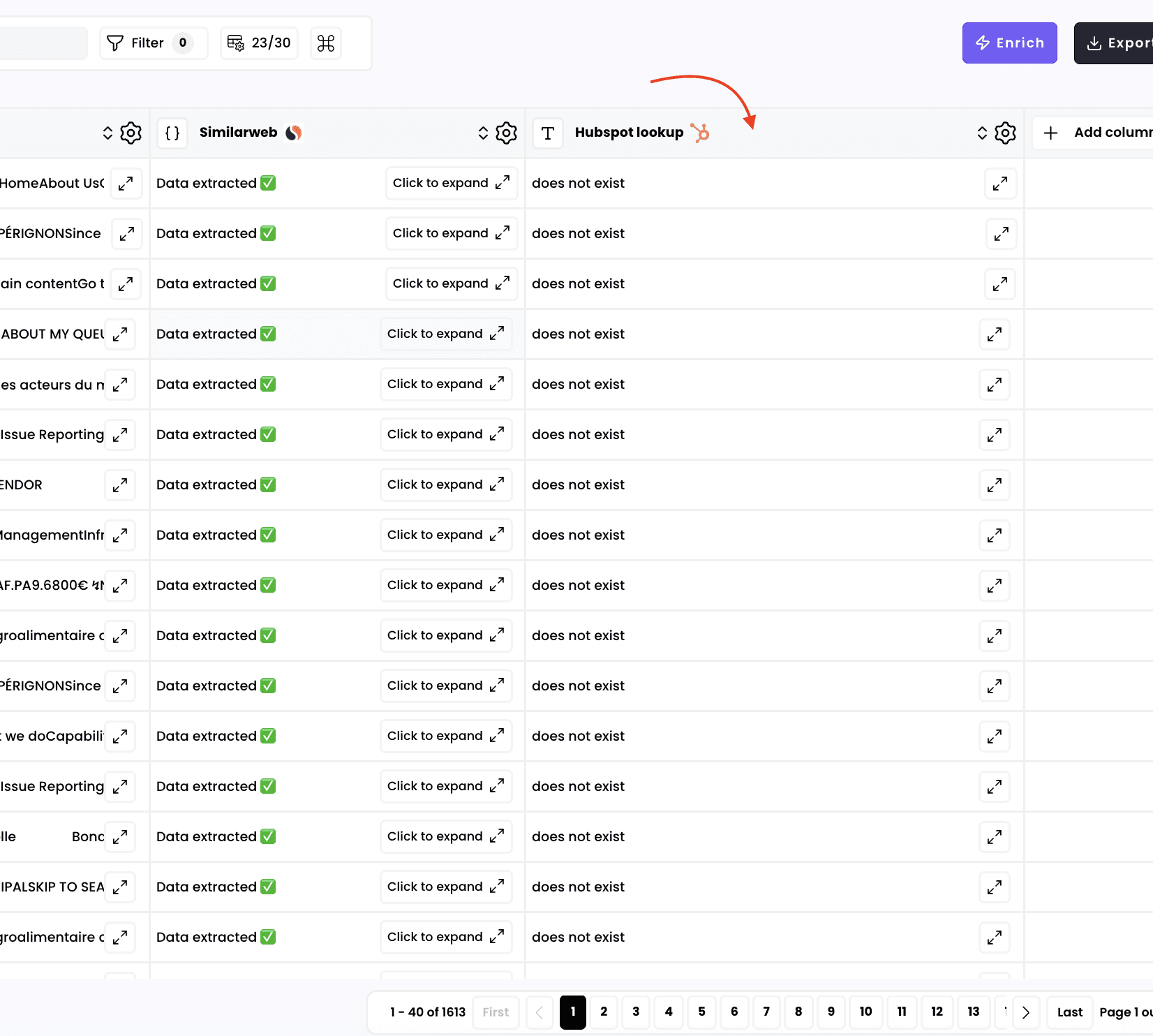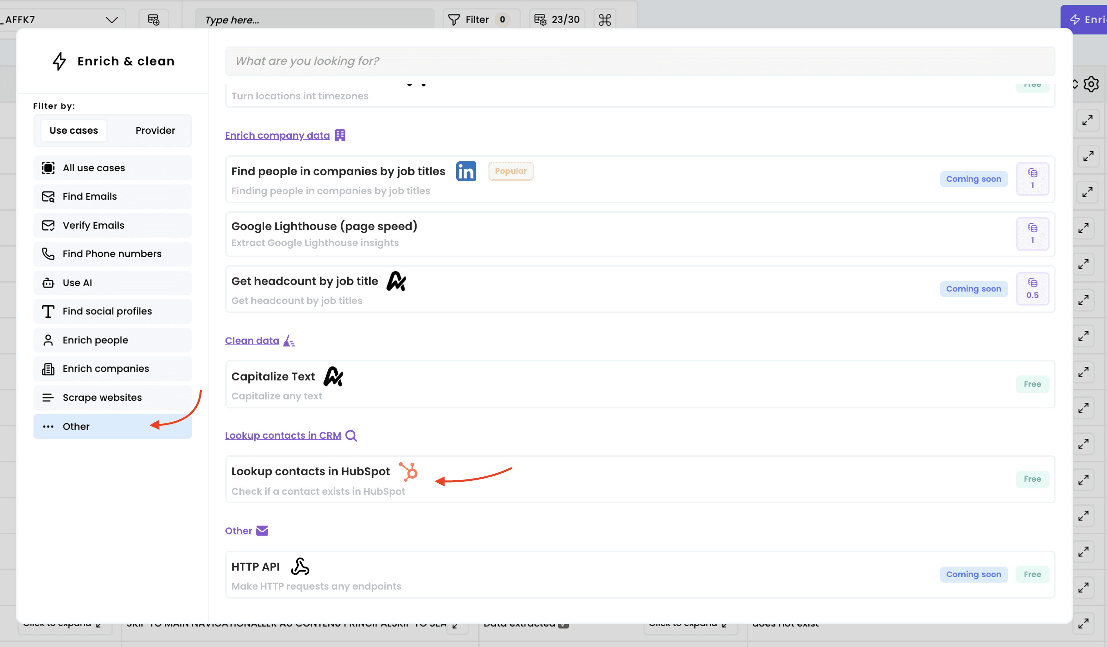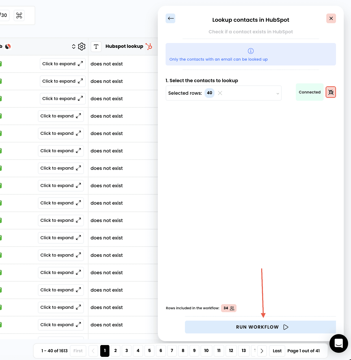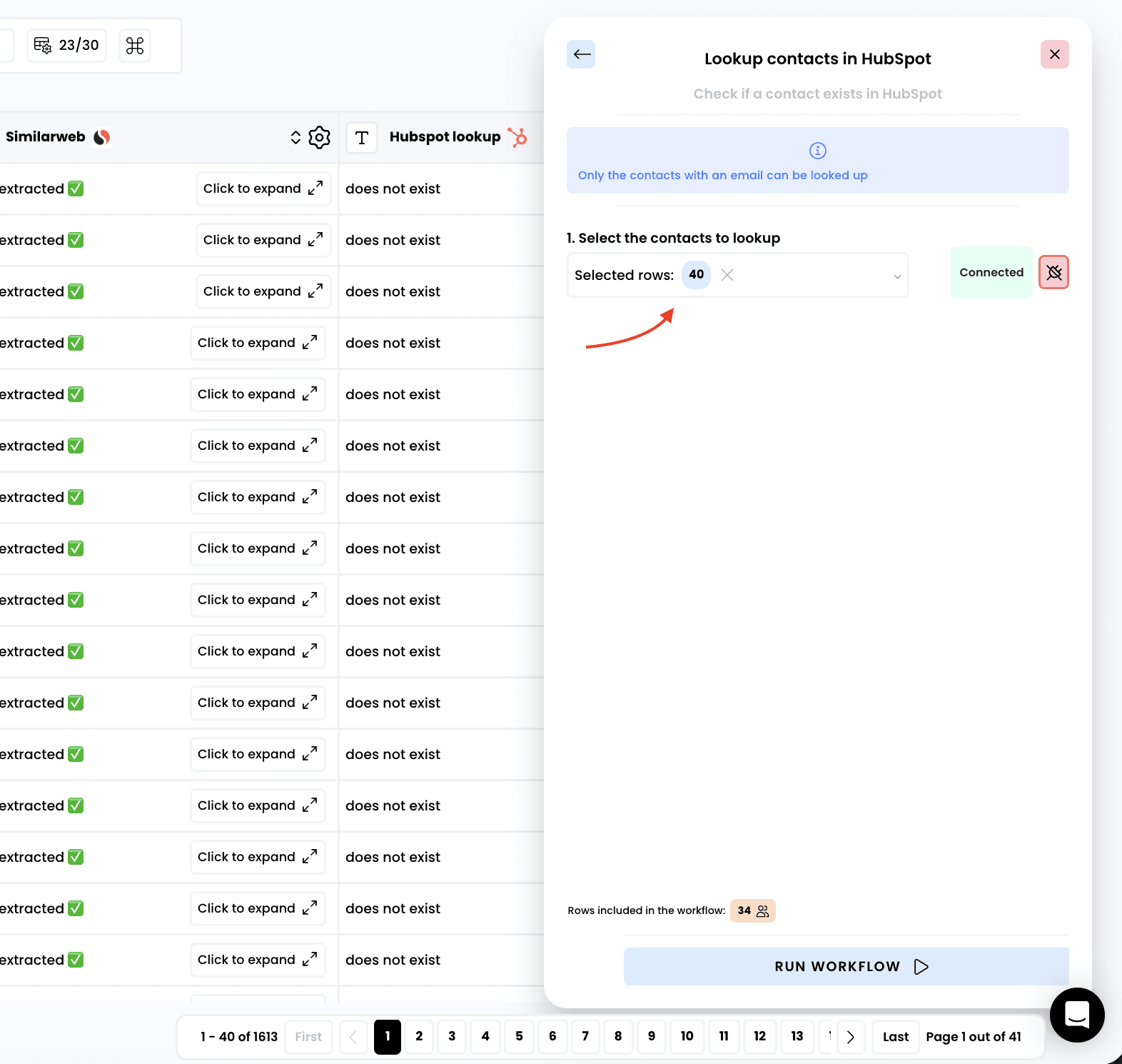 Lookup contacts in HubspotLookup contacts in HubspotCheck if a contact already exists in your CRMCheck if a contact already exists in your CRM1Select the enrichment1Select the enrichment2Select the rows to enrich2Select the rows to enrich3Run the workflow3Run the workflow4Access the results4Access the results