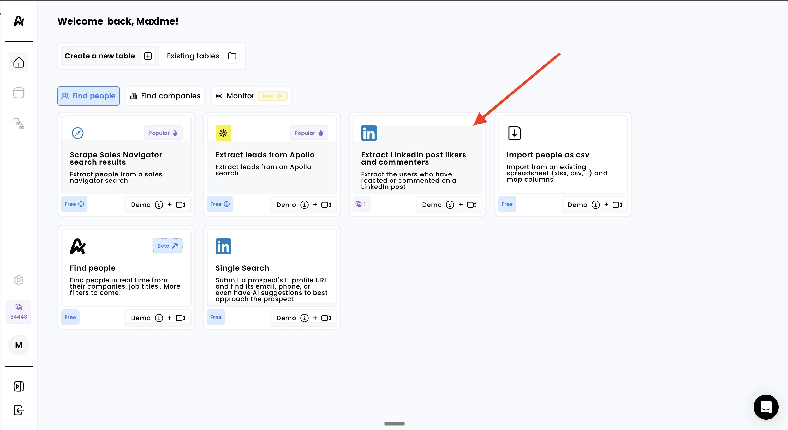 Select "Extract LinkedIn post likers and commenters" from the available options in the "Find People" tab