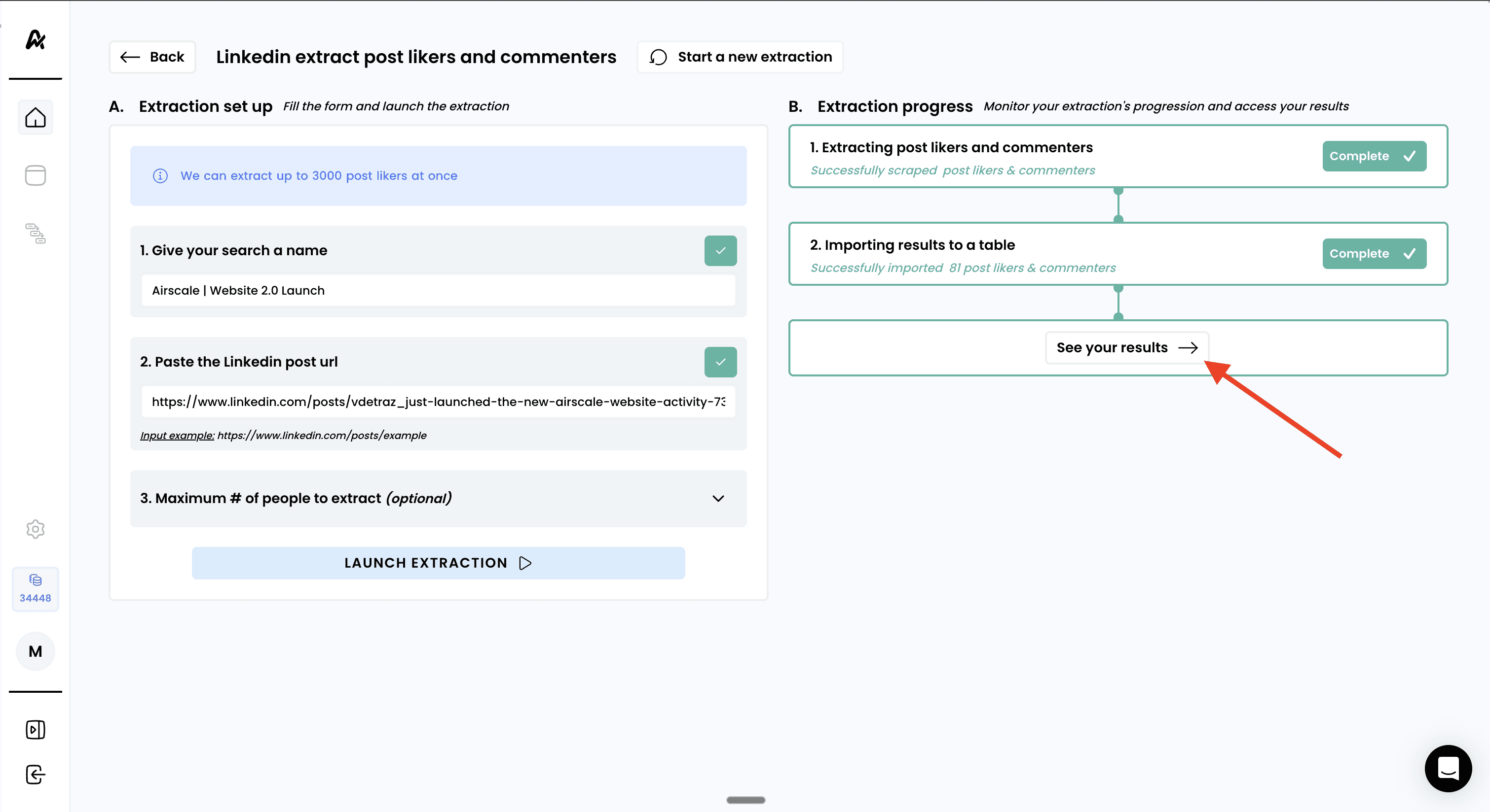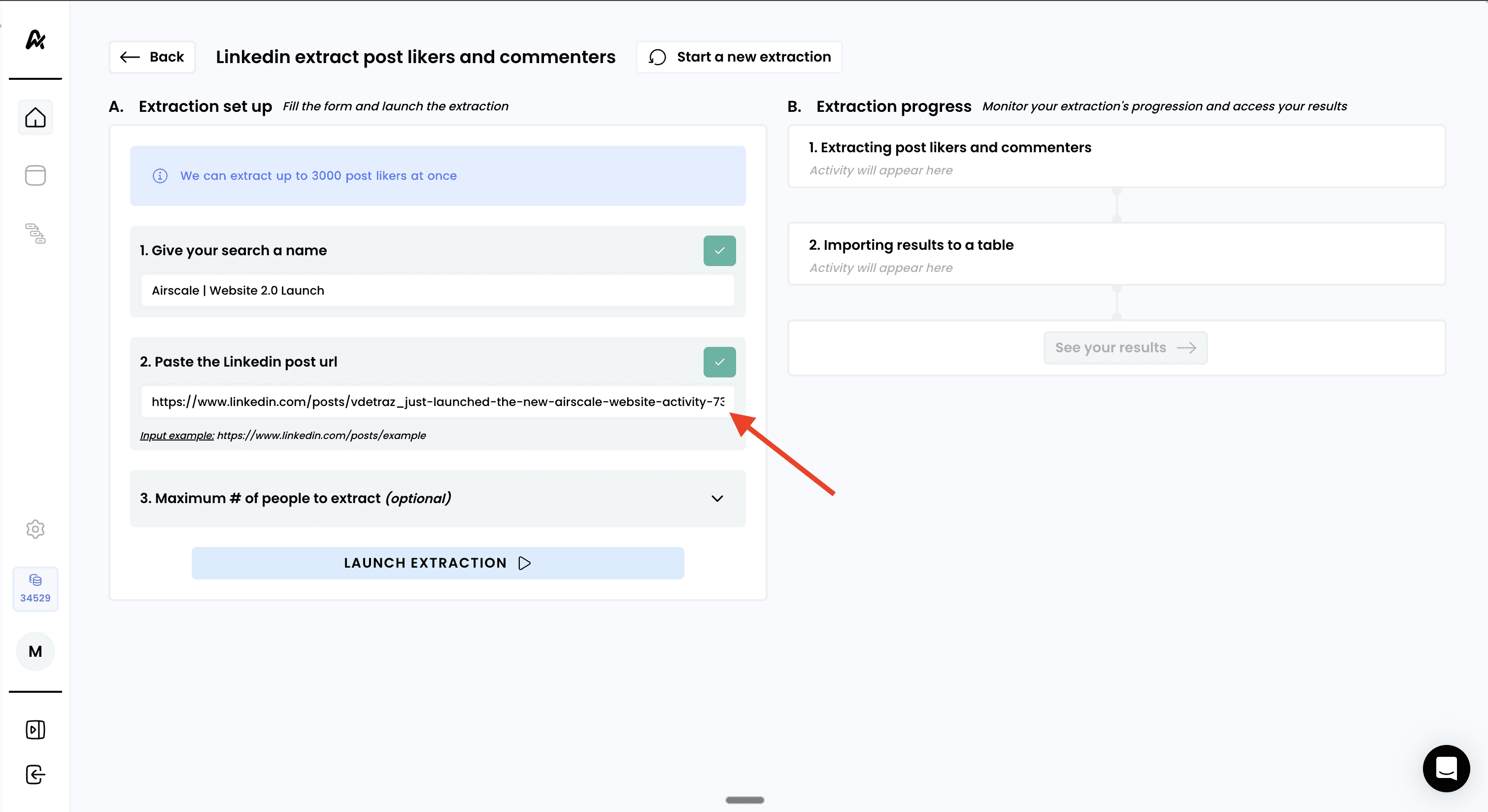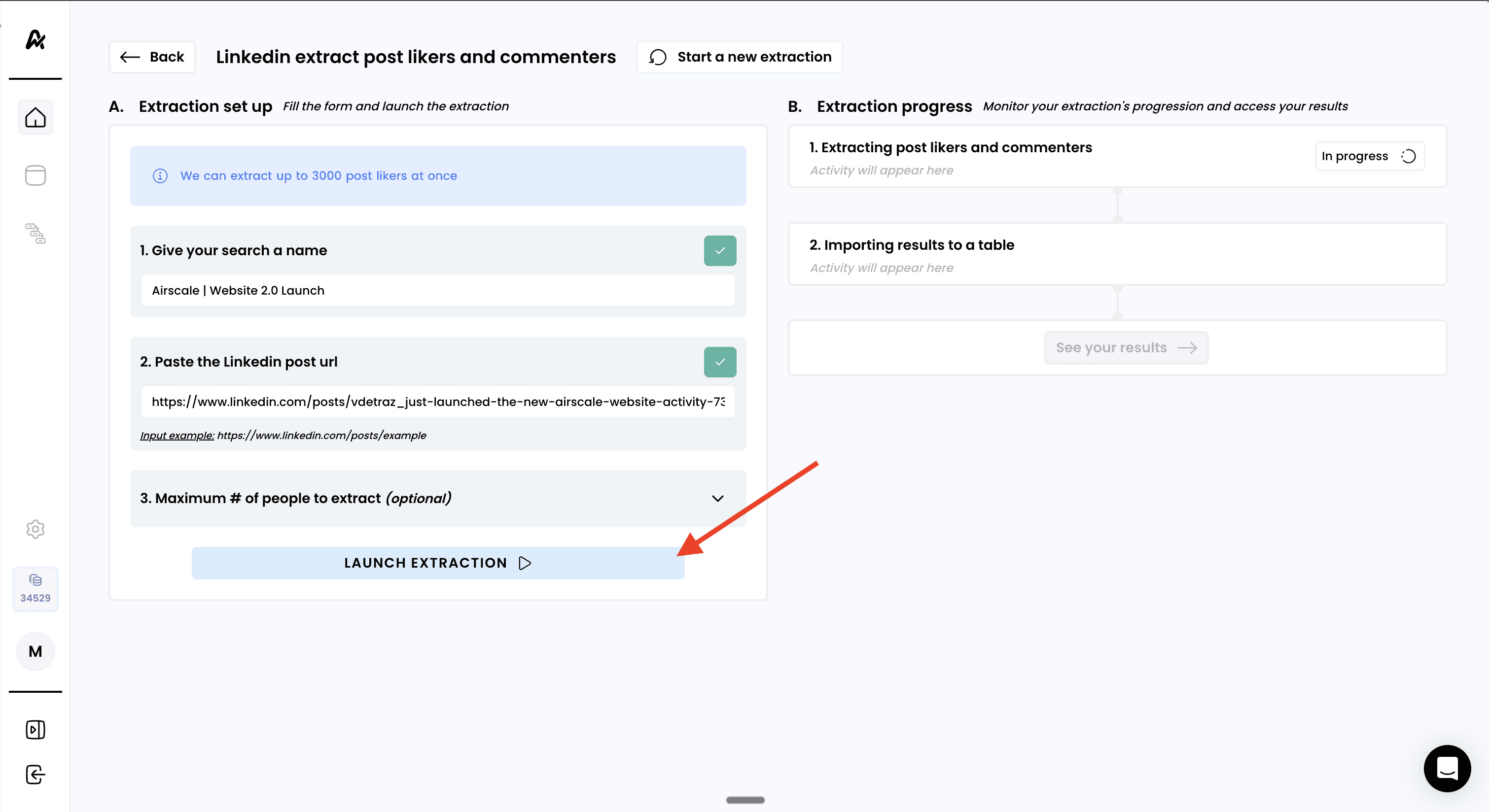Find highly engaged prospects by extracting users who have liked or commented on specific LinkedIn posts. This powerful feature helps you identify people already interested in topics relevant to your business, making them warmer prospects for outreach